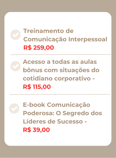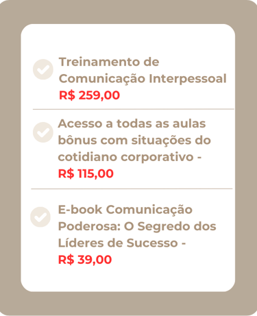 Aulas bônus recorrentes com técnicas práticas e soluções para os desafios da comunicação nos dias de hoje. Aprenda a lidar com situações reais do dia a dia, se expressar com clareza e se comunicar com segurança em um ambiente profissional cada vez mais dinâmico e desafiador.